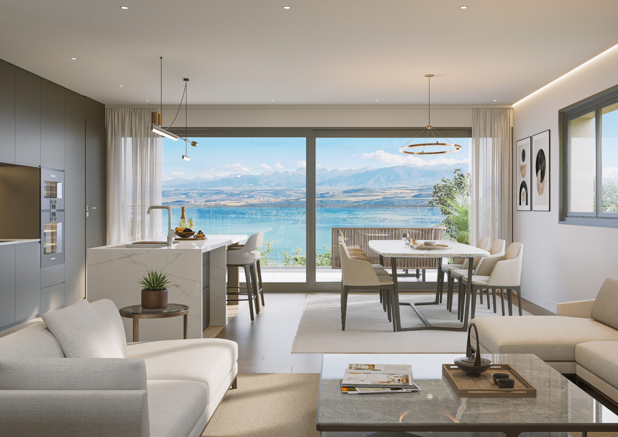 À Villars-Burquin, Villa Panorama propose des villas pensées pour offrir un art de vivre simple et serein. Ouvertes sur l’extérieur, elles laissent entrer la lumière et le panorama du lac de Neuchâtel, créant des espaces où l’on se sent naturellement chez soi.